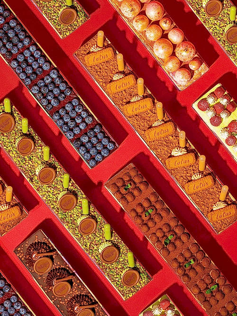 Lotuslu Pasta : Karamelli ıslak kek, sütlü çikolatalı ganaj, Lotuslu Bavyera krema, lotus dolgu ve bisküvi parçaları,