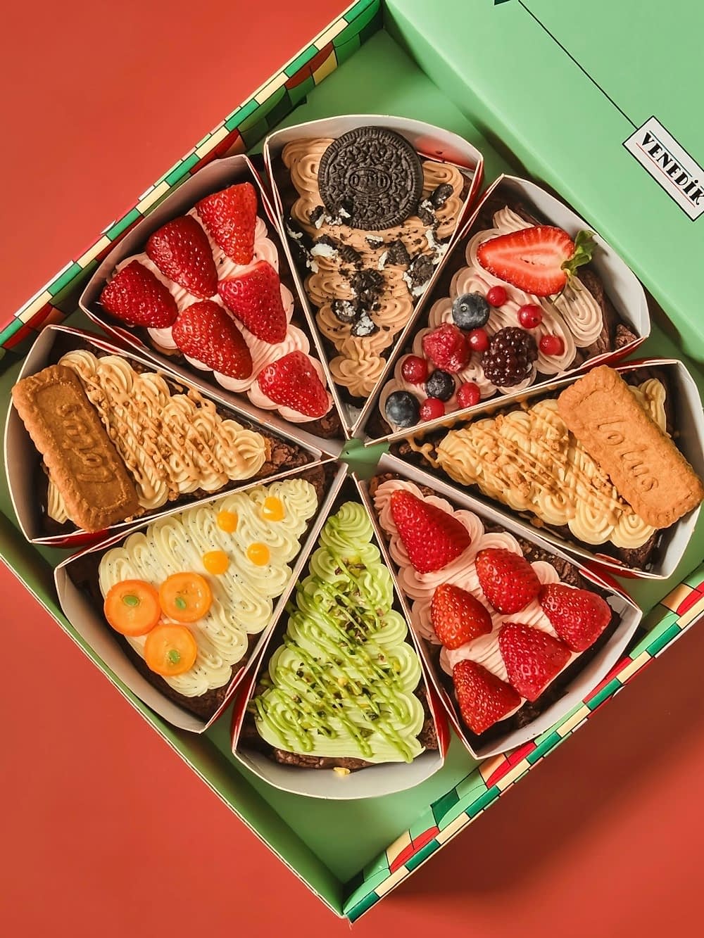 Venedik’in tabanı bitter Belçika çikolatası ve tereyağıyla hazırlanan; ceviz-beyaz çikolatalı, lotus bisküvili, orman meyveli, portakal ve Antep fıstıklı 8 dilim brownieden oluşuyor.