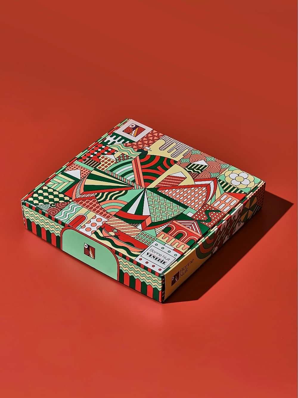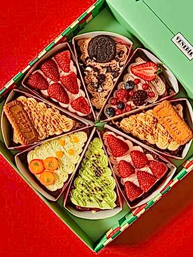Venedik’in tabanı bitter Belçika çikolatası ve tereyağıyla hazırlanan; ceviz-beyaz çikolatalı, lotus bisküvili, orman meyveli, portakal ve Antep fıstıklı 8 dilim brownieden oluşuyor.